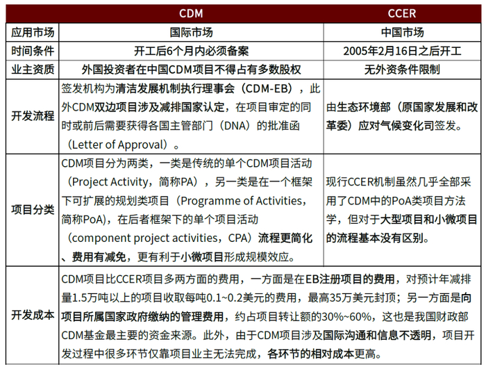 从发展历程上看,CCER的建立晚于海外的CDM,两类项目在性质与申请流程上仅略有不同。通过对比可以发现,CCER对于项目时间、业主等限制条件更为宽松,开发流程复杂程度与相关成本相对更低,但在对小微项目的支持等方面相较CDM仍有完善空间。CDM项目在满足一定条件基础上可转为CCER。