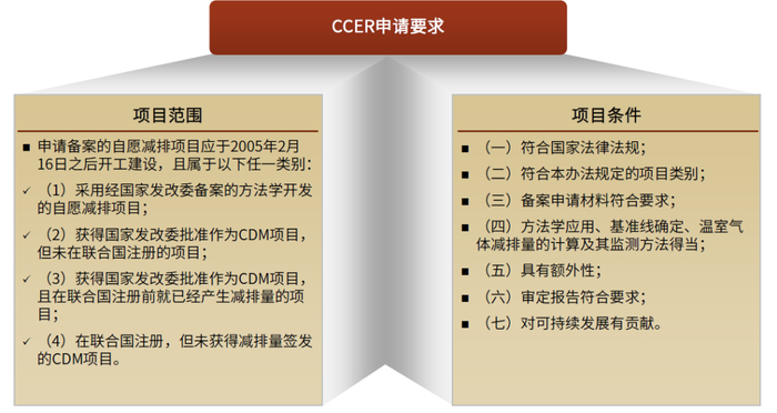 《温室气体自愿减排交易管理暂行办法》指明CCER项目范围及申请要求。2012年6月,国家发展改革委发布的《温室气体自愿减排交易管理暂行办法》对CCER项目开发、交易和管理进行了系统规范。根据《办法》要求,申请备案的自愿减排项目应于2005年2月16日之后开工建设,且属于以下任一类别: