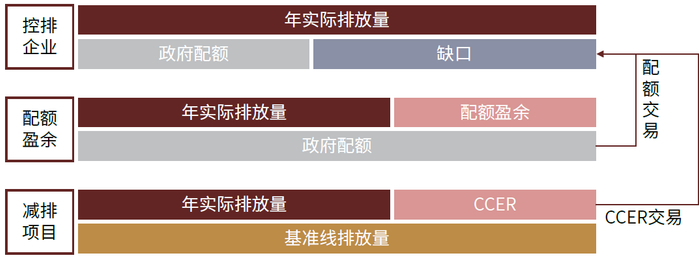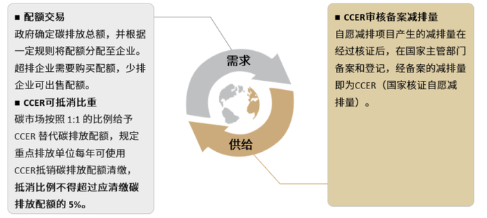 碳市场建设的本质是为体现减排的合理生态价值。目前全国碳交易市场由配额市场(强制市场)和CCER市场(自愿市场)组成。配额市场的控排企业由生态环境主管部门分配排放额度,企业可以按照自身的盈余和缺口交易;CCER市场可以通过抵消机制和配额市场产生联动,重点排放单位可使用CCER或其他减排指标,抵消不超过5%的实际排放量。