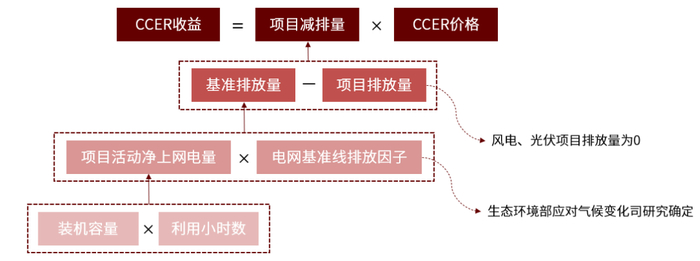 受益CCER交易,风电、光伏企业有望获得增量收益。由于风电机组和光伏板等材料生产过程中的排放并不包含在计算范围中,而风电、光伏项目发电过程排放量为0,故风电光伏项目的减排量就是基准线情景下的排放量,即所发电力均为火电时的排放量。因此二者在减排量的计算方法类似(如下图)。我们认为风电光伏在发电量占全社会用电量比重稳步提升背景下,有望通过清洁能源替代方式实现碳减排,并受益CCER交易获取增量收入。我们测算CCER对风电、光伏利润弹性分别约为35.2%,21.6%。