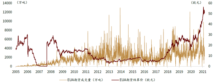 ►管理办法出台推动碳交易市场快速发展:2021年以来,在碳达峰、碳中和愿景下,我国的碳交易市场建设在各项政策文件的推动下不断提速。2021年1月,生态环境部审议通过《碳排放权交易管理办法(试行)》,明确了碳市场的参与主体和监管部门等各方的责任、权利和义务。2021年5月,生态环境部组织制定的碳排放权登记、交易、结算管理规则相关的三份文件正式出台,我们看好文件出台对进一步规范全国碳市场交易活动的积极意义。