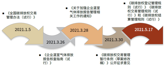 碳交易市场从试点到全国,从单个行业到覆盖各耗能主体,政策推动快速发展。碳交易市场的建立有助于从市场化的角度提升绿色低碳项目和技术的经济价值,促进企业绿色生活生产方式转型,利于全国绿色低碳行业发展,目前我国碳交易市场正在逐步完善: