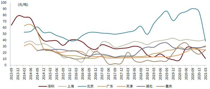 固废资源化有望受益CCER加速发展。根据RMI测算,钢铁、水泥、铝和塑料行业到2050年有高达230亿吨的碳减排潜力,而资源化是其中重要的一环,也是助力碳中和目标实现的重要手段之一。据相关研究[2],废纸/废铜/塑料的回收温室气体减排效率分别达5.42/14/0.36 tCO2e/t,按CCER价格30元/吨测算,吨处理增量收益分别为162.6/420/10.8元。我们认为固废资源化有望受益CCER,未来逐步释放碳减排潜力的同时获取碳交易市场增量收益。