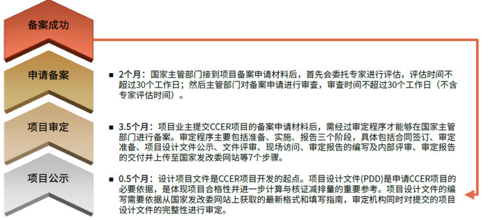 CCER项目备案审批时间周期约为3-6个月。根据《碳排放权交易管理办法(试行)》,CCER项目备案审批主要需经历项目公示、项目审定和申请备案等环节。其中,项目公示前需要编写项目设计文件,并由审定机构对提交的项目设计文件的完整性进行审定,预计需要0.5个月左右的时间;项目审定阶段主要包括准备、实施和报告三个阶段,预计需要3.5个月左右的时间;申请备案环节则包括国家主管部门委托专家评估,以及主管部门审查备案申请,总计需要2个月左右。根据我们推算,整个申请备案的审批周期在60-120个工作日之间,即大约需要3-6个月时间。