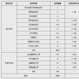 据央行官网最近一次公布2020年四季度的评级结果,4399家银行业金融机构的评级,包含大型银行24家、中小银行3999家、非银行机构376家。