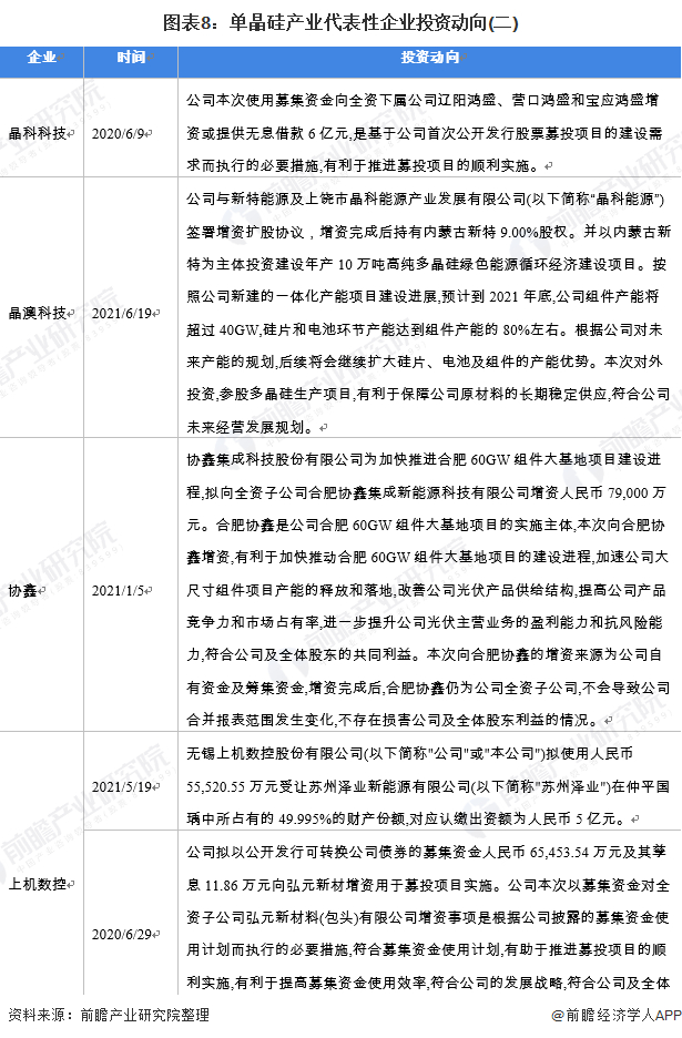 2020年以来,单晶硅产业代表性企业的投资动向主要包括收购公司拓展业务、通过对子公司增资的方式投资单晶硅生产基地项目。单晶硅产业代表性企业最新投资动向如下: