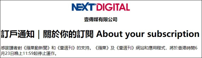 通知称,《苹果日报》及《壹周刊》网站和应用软件于23日晚上11:59起停止运作,但并未提及给订阅用户退款等具体补偿细节,仅称“我们现正咨询法律意见,如有最新消息,将会再通知订户”。