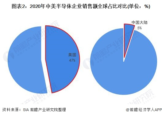 根据美国半导体行业协会(SIA)发布的最新数据显示,美国的半导体企业销售额占据全球半导体销售额的47%,而中国大陆半导体企业销售额仅占全球半导体销售额的5%。