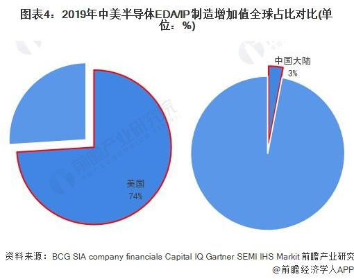 EDA/IP被称作半导体“皇冠上的明珠”,撬动了几千亿美元的半导体产业。在EDA/IP细分市场,美国一国独大,2019年美国EDA/IP制造增加值占全球比重高达74%,中国大陆仅占3%。