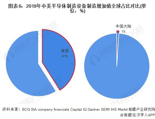 在半导体制造设备细分市场,美国依旧占据了全球主导地位,2019年美国半导体制造设备制造增加值占据了全球41%的市场份额;而中国大陆占比仅为1%。
