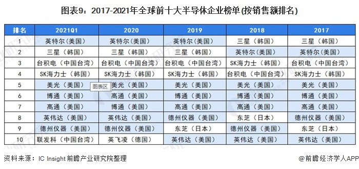 2017-2021年第一季度,在全球前十大半导体企业榜单中,并未有中国大陆企业的身影。美国每年都有6家企业入榜。并且,在2019-2021年第一季度,美国半导体企业英特尔位居榜首。