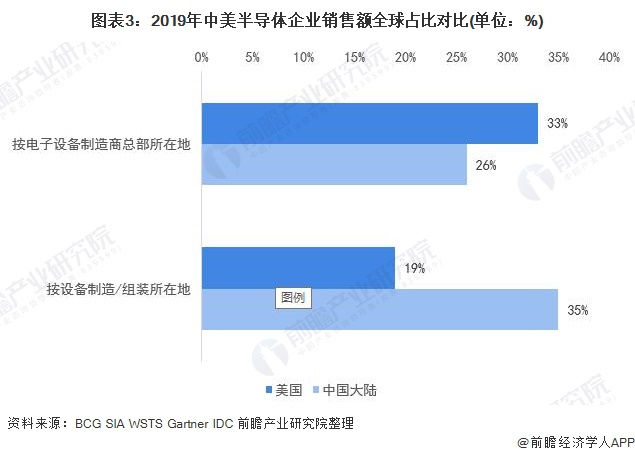 根据BCG和SIA联合发布的《在不确定的时代加强全球半导体产业产业链(2021.04)》的报告显示,2019年,若按电子设备制造商总部所在地统计,美国半导体企业销售额全球排名第一,销售额占比33%;中国大陆排名第二,销售额占比为26%。