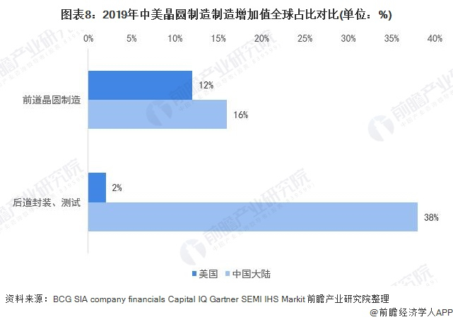 在后道封装、测试方面,2019年中国大陆市场份额更是高达38%,美国占比仅为2%。