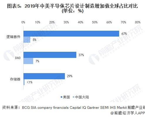芯片设计是典型的人才和智力密集型产业。在芯片设计细分市场上,美国遥遥领先于中国大陆,美国的逻辑、DAO、存储制造增加值市场份额占比分别为67%、37%和29%。