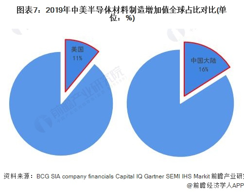半导体材料在晶圆制造中也起到关键性作用。在半导体材料细分市场,中国大陆领先于美国,2019年中国大陆半导体材料制造增加值占据了全球16%的市场份额;而美国为11%。