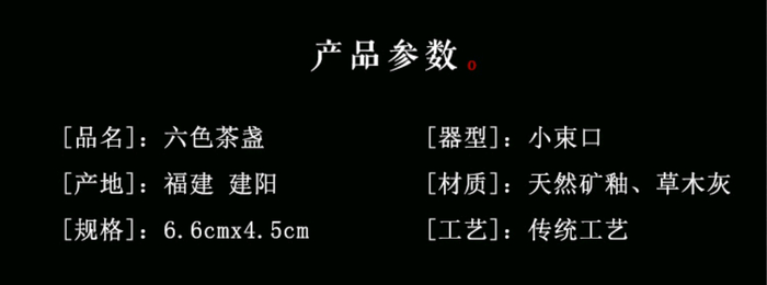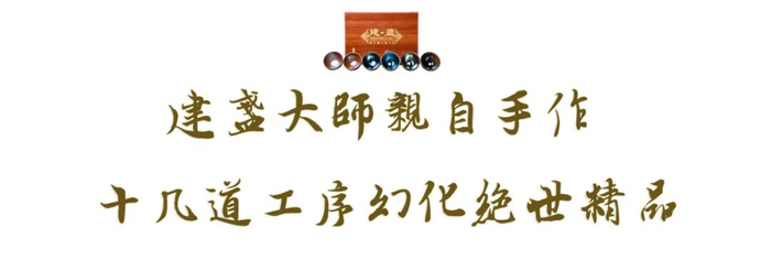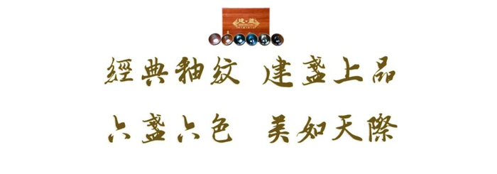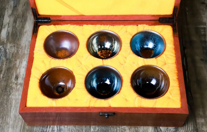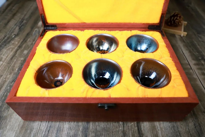 内含银油滴、蓝龙鳞、黄鹧鸪、红鹧鸪、紫金、雨滴六种釉色建盏各1只,均由老牌建盏大师金长有亲制。