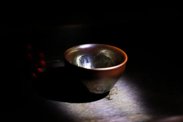 彩金烧制在油滴盏中难度颇大,油滴在不同光照下呈现不同的颜色。