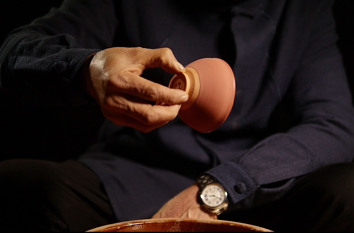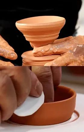 将揉泥后的泥块放置于转动的轮盘上,用手拉出预先计划的器型,这一步对匠人的手艺要求极高,盏型的好坏关键就在这一步。