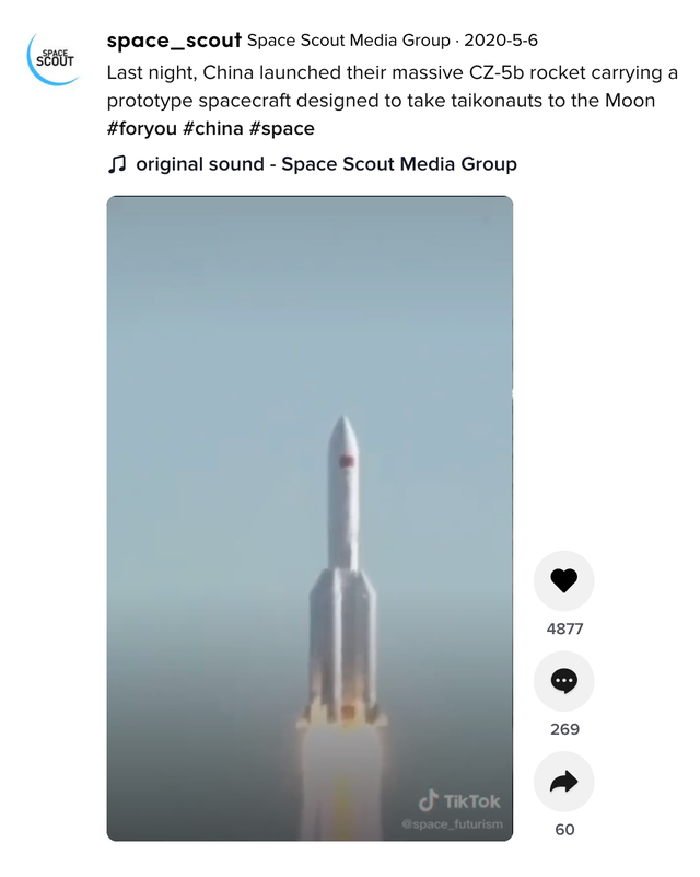 2020年5月,长征五号B运载火箭发射,TikTok用户使用“taikonauts”一词