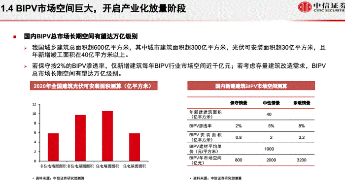 根据国家统计局数据和中国建筑科学研究院测算,我国目前既有建筑面积约800亿平方米,同时目前市场上每年新增近一亿平方米的采光瓦屋顶面积,一旦走向规模化应用,分布式光伏将是一个近万亿元的市场。