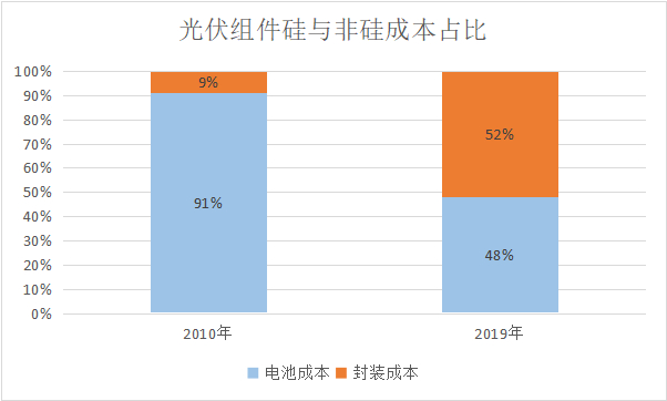 在行业发展初期,受生产工艺水平较低影响,硅料用量比较大,原材料价格也偏高,导致当时硅料在光伏设备的总成本中占比极高。2010年,一个光伏组件中的电池成本(含硅部件)高达91%,到2019年已经下降至了48%,几乎减半。