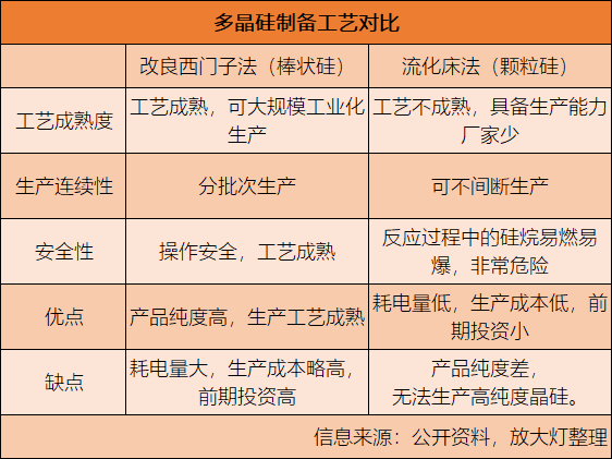 除了“改良西门子法”,目前多晶硅料的制备还有“硅烷流化床法”制硅路线(在流化床反应器中利用硅烷法分解,并在预先装入的细硅粒表面生成多晶硅颗粒,产品形态为颗粒硅),较当前主流工艺有成本优势,能够对产业形成一定的补充。但该技术并不成熟,工艺存在缺陷,限制了在行业内的产能比例。