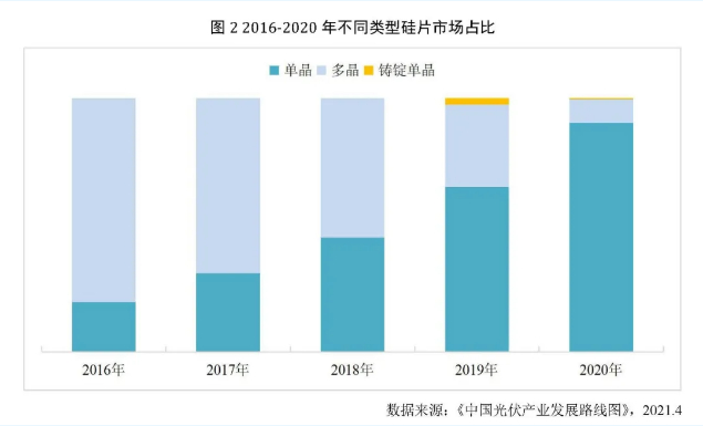 在成本和转换效率的此消彼长之下,单晶硅迅速崛起。截至2020年底,单晶硅片的市占率已经从2016年的20%,提升至超过90%,已实现了对多晶硅片的全面替代。
