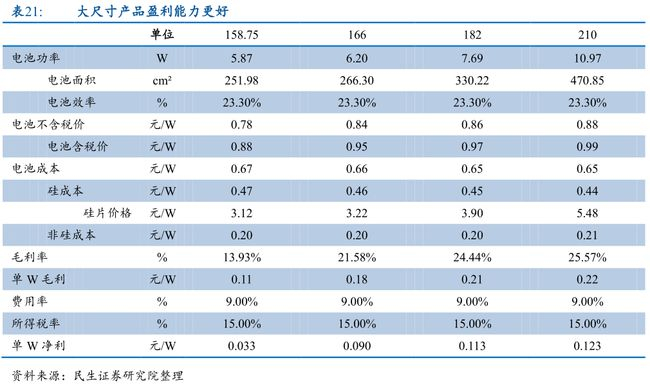 这一系列优势积累下来,就是终端利润的提高,预估每瓦毛利可提升近0.1元。不过大尺寸同样也要求下游生产工艺的同步改善,需要一定的产业链协同发展。