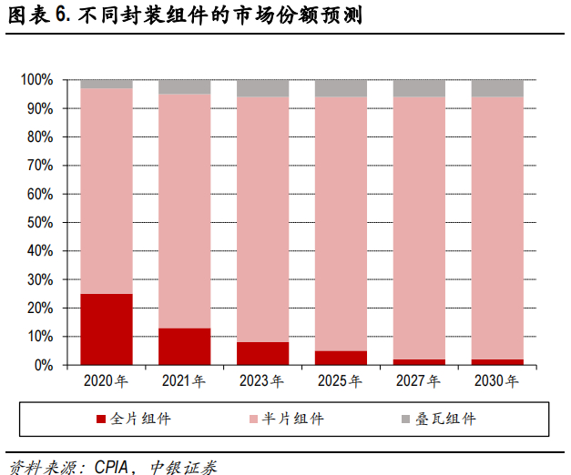 除了上述两种趋势,光伏组件还有众多其它路线,如拼片、叠瓦、无主栅和多主栅等,细分市场比较多。不过这些路线要么仅改变了一些设计细节,要么没有得到广泛应用,或是和当前组装工艺可以相互叠加,作为补充出现,故不再进一步详述。