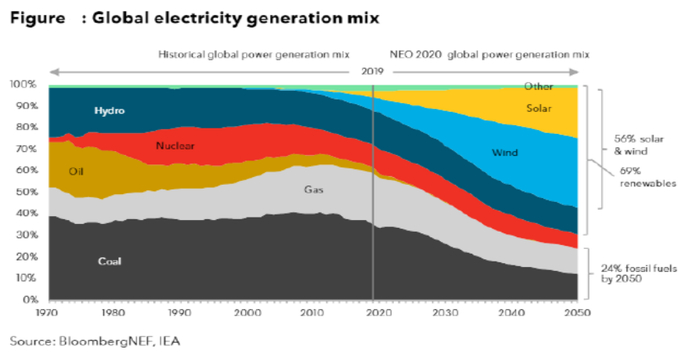 根据中国光伏行业协会预测,“十四五”期间,国内年均光伏新增装机量,将是2020年的1.5~2倍左右。而在全球范围内,彭博预测,到2050年,全球电力结构中,光伏和风能的占比将达到56%(见下图)。