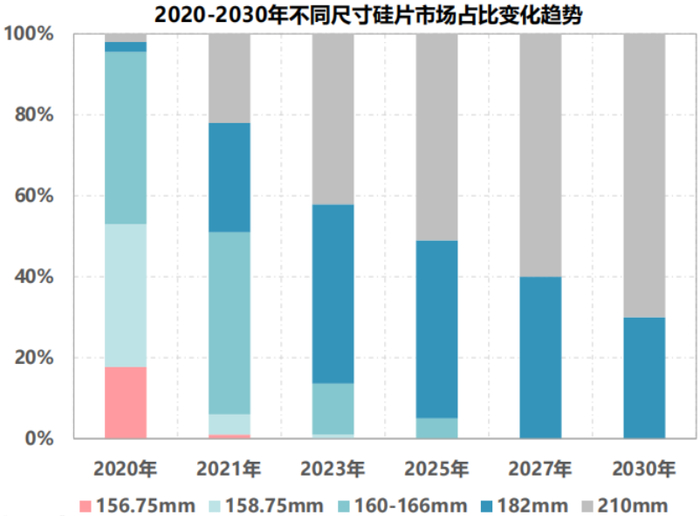 大尺寸化正在加快。156.75mm与158.75mm规格正在被快速淘汰,166mm成为主流,182mm和210mm产能也在持续提升,快速进入市场。