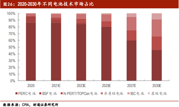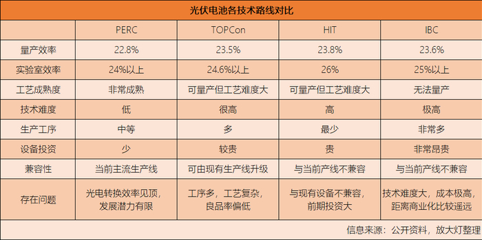 目前,单晶PERC产品作为主流光伏电池,生产工艺成熟,产能高,光电转换效率可达23%,较上一代的BSF电池优势明显,是性价比最高的电池技术路线。但PERC电池的问题是,其效率已经逼近24.5%的理论极限,未来优化空间非常有限。这是促使行业开始寻找下一代电池的主要原因之一。