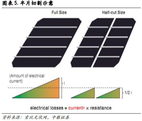 半片封装则是目前的主流封装模式,是指沿着垂直于电池主栅线的方向将电池片切成尺寸相同的两个半片电池片。光伏电池片在发电过程中产生的电流和电池片面积有关,因此相对于整片,半片电池中通过主栅线的电流大小仅约1/2。当半片电池串联以后,单个正负回路上电阻不变,单回路的功率损耗就降低为原来的1/4,从而降低了组件的整体功率损失,同时也减小了组件升温对发电能力的负面影响。