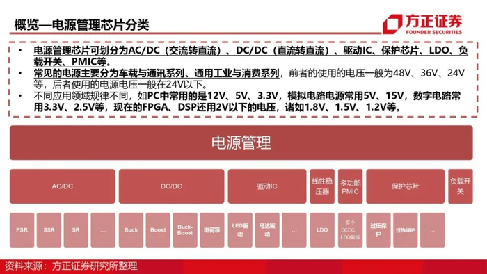电源管理芯片可划分为AC/DC(交流转直流)、DC/DC(直流转直流)、驱动IC、保护芯片、LDO、负载开关、PMIC等。