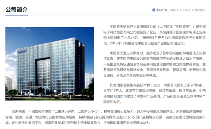 据中国普天官网资料显示,中国普天是国务院国资委直接管理的中央企业,其前身源于国家原邮电部工业局和中国邮电工业总公司,1999年9月更名为中国普天信息产业集团公司,2017年12月更名为中国普天信息产业集团有限公司。