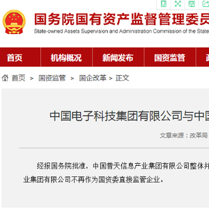 据新华社,国务院国资委网站23日发布消息,经报国务院批准,中国普天信息产业集团有限公司整体并入中国电子科技集团有限公司,成为其全资子企业。中国普天信息产业集团有限公司不再作为国资委直接监管企业。