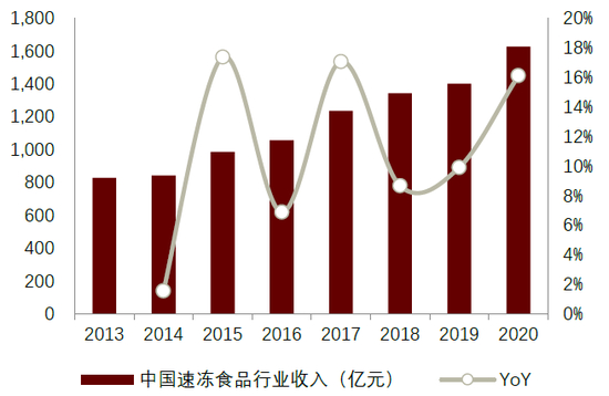 图表:2020年我国速冻食品行业规模1626亿元