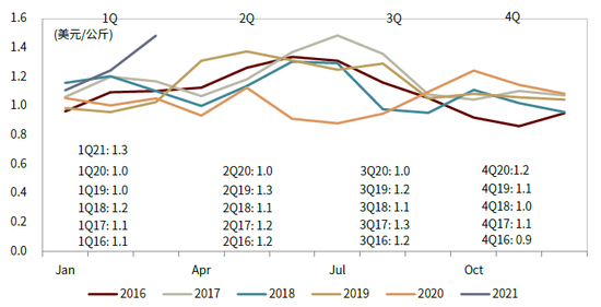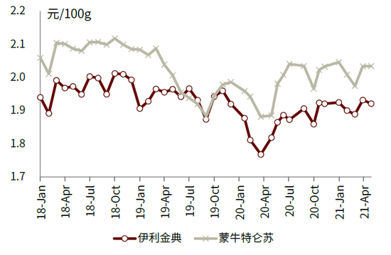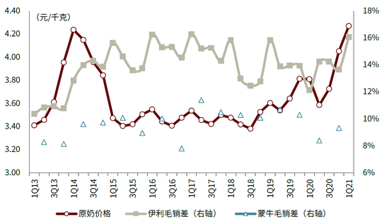 图表:1Q13-1Q21原奶价格及伊利、蒙牛毛销差