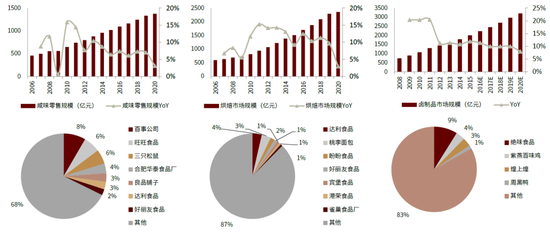 资料来源:Frost & Sullivan,Euromonitor,中国产业信息网,中金公司研究部;注:食醋和料酒为2018年数据(增速同),其余为2019年数据