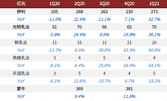 资料来源:公司公告,中金公司研究部;注:1)新乳业数据存并表影响;2)蒙牛数据为剔除君乐宝剥离的可比口径数据,2Q20与4Q20数据分别代表1H20与2H20,下同