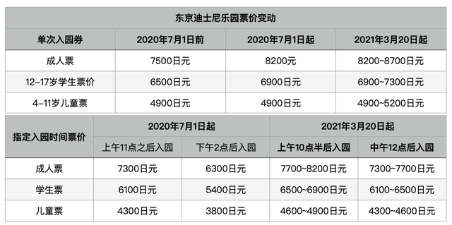 看似更为灵活的票价制定结构,实则票价呈上涨态势。此外,东京迪士尼乐园票价变动也颇为频繁。2020年7月1日就已变动过一次票价的东京迪士尼乐园,于今年3月20日再次变动票价,实行起门票浮动价格制,其中周末节日和旺季的成人一日门票比之前的8200日元还要高出500日元。