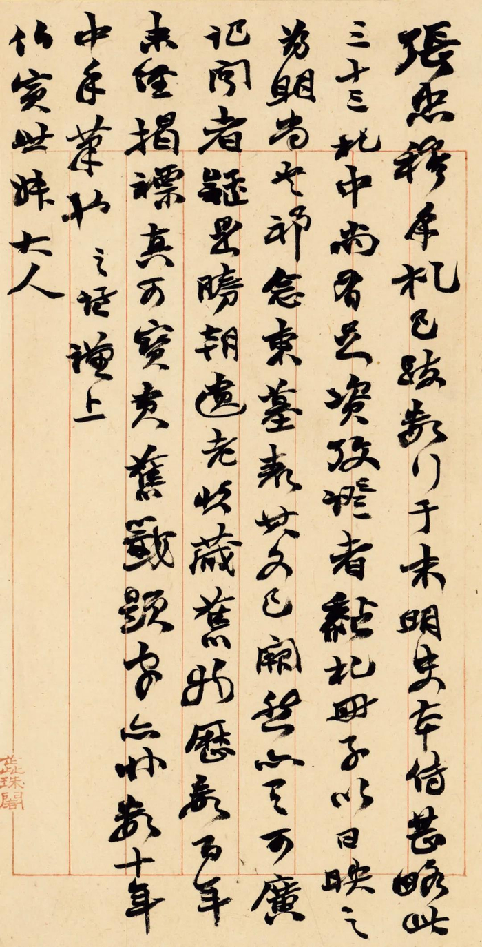 致潘祖荫信札:张忠穆手札已跋数行于末,《明史本传》甚略。此三十三札中,尚有足资考证者。黏札册子以日映之,为明尚书祁念东墓表,其文已阙,然亦有可广记闻者,疑是胜朝遗老收藏旧物,历数百年未经揭褾,真可宝贵。旧签题字,亦非数十年中手笔也。之谦谨上。伯寅世叔大人。