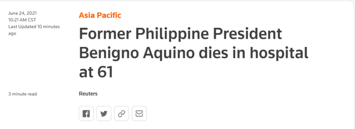《马尼拉公报》称,阿基诺三世被紧急送往医院后,因心力衰竭去世。据报道,他曾与肺癌作斗争,并因肾脏疾病接受了透析,之前还做过血管成形术。