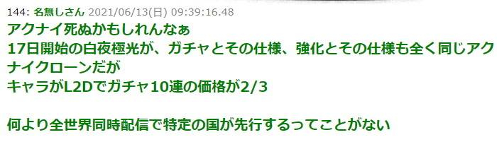 开测以后,更有日本玩家调侃《白夜极光》的抽卡、强化等设计,完全是方舟的克隆版,然而角色L2D化以后,抽卡价格降了1/3,是要逼死方舟的节奏。当然这些都是中国游戏的你争我夺,日本玩家更多还是看戏吃瓜的态度。