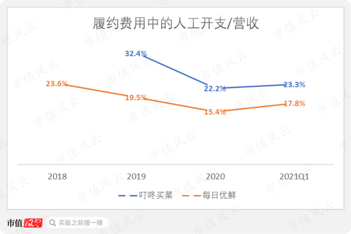 综合来看,叮咚买菜和每日优鲜履约费用中的配送和仓库人工开支占营收的比例都在下降,其中2020年分别为22.2%、15.4%。
