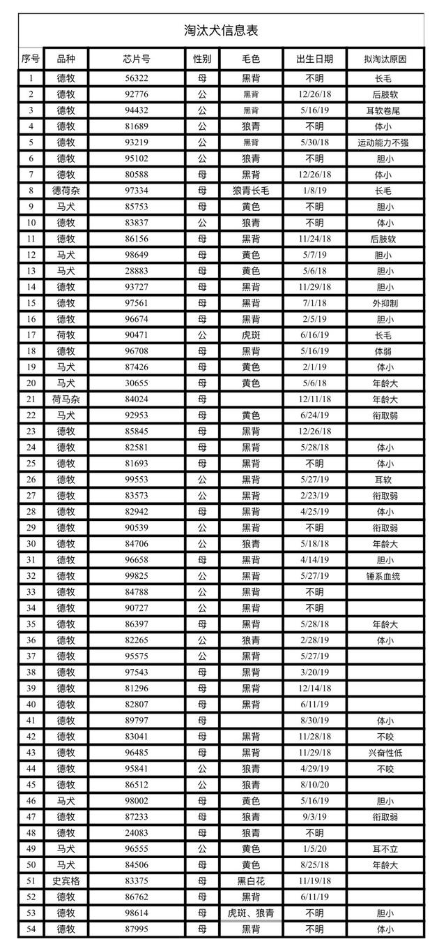 《公告》后的《淘汰犬信息表》还注明了犬只性别、毛色等特征以及被淘汰的原因。新京报记者注意到,其中有德牧、德荷杂、马犬、荷牧、荷马杂、史宾格六个品种,最小的2020年1月生,最大的2018年5月生,它们被淘汰的原因包括运动能力不强、胆小、体小、年龄大、兴奋性低、衔取弱、后肢软等。 2018年5月生的犬只已经属于“年龄大”。