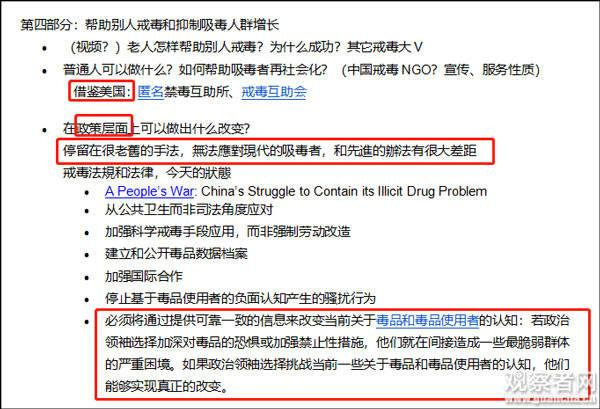 第四部分,提出让“中国借鉴美国”的建议,甚至把中国根据国情采取的与时俱进的戒毒措施贬低为“停留在很老旧的手法,无法应对现代的吸毒者,和先进的办法有很大差距”,最后直接上升到“政策层面”,开始“政治污蔑”。