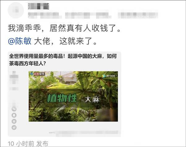 看到网上出现标题为“起源于中国的大麻如何荼毒西方年轻人”的视频,有网友质疑称,已经有人开始“收钱抹黑中国毒品问题”。