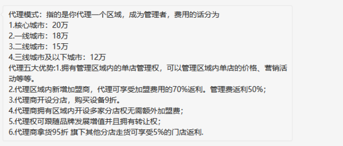 这三家品牌,单店的加盟费用从4万到8万不等,区域代理商的费用则是9万到20万不等。一般都会推荐区域代理商,比较大的特权是,可以免费在代理区域内自由开店;如果未来代理区域内新增加盟商,区域代理可享受加盟费用70%的返利;区域代理所开的门店原材料可以有9折或95折的优惠,未来区域内的加盟商需要从区域代理购进原材料,这也意味着原材料也可以拿到5%到10%的返利。