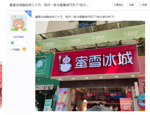 一条标题,再配上一张蜜雪冰城的门店图。蜜雪冰城百度贴吧前排,摆着类似几条帖子。